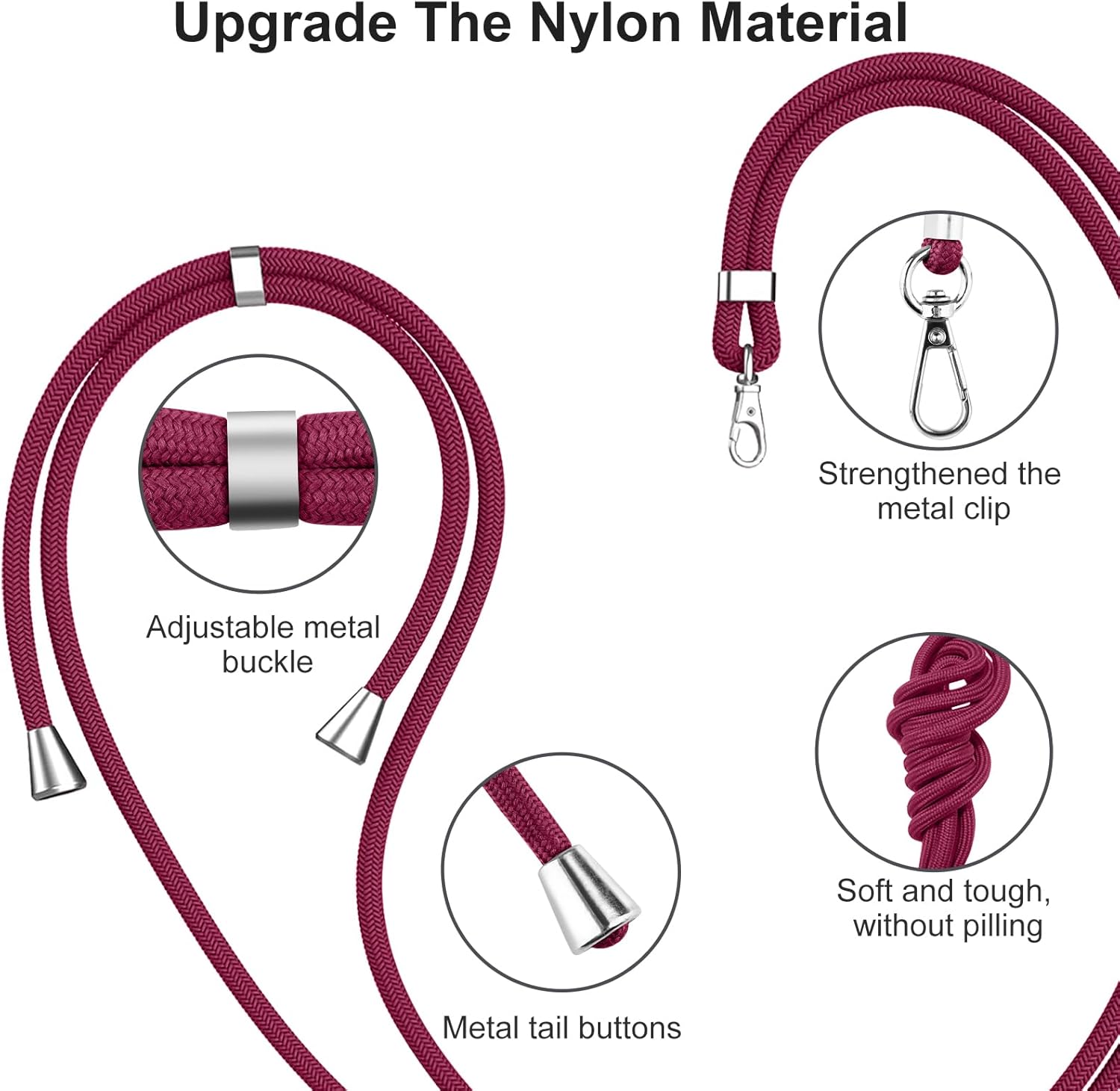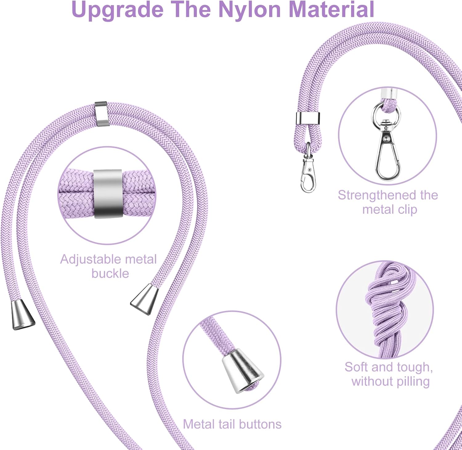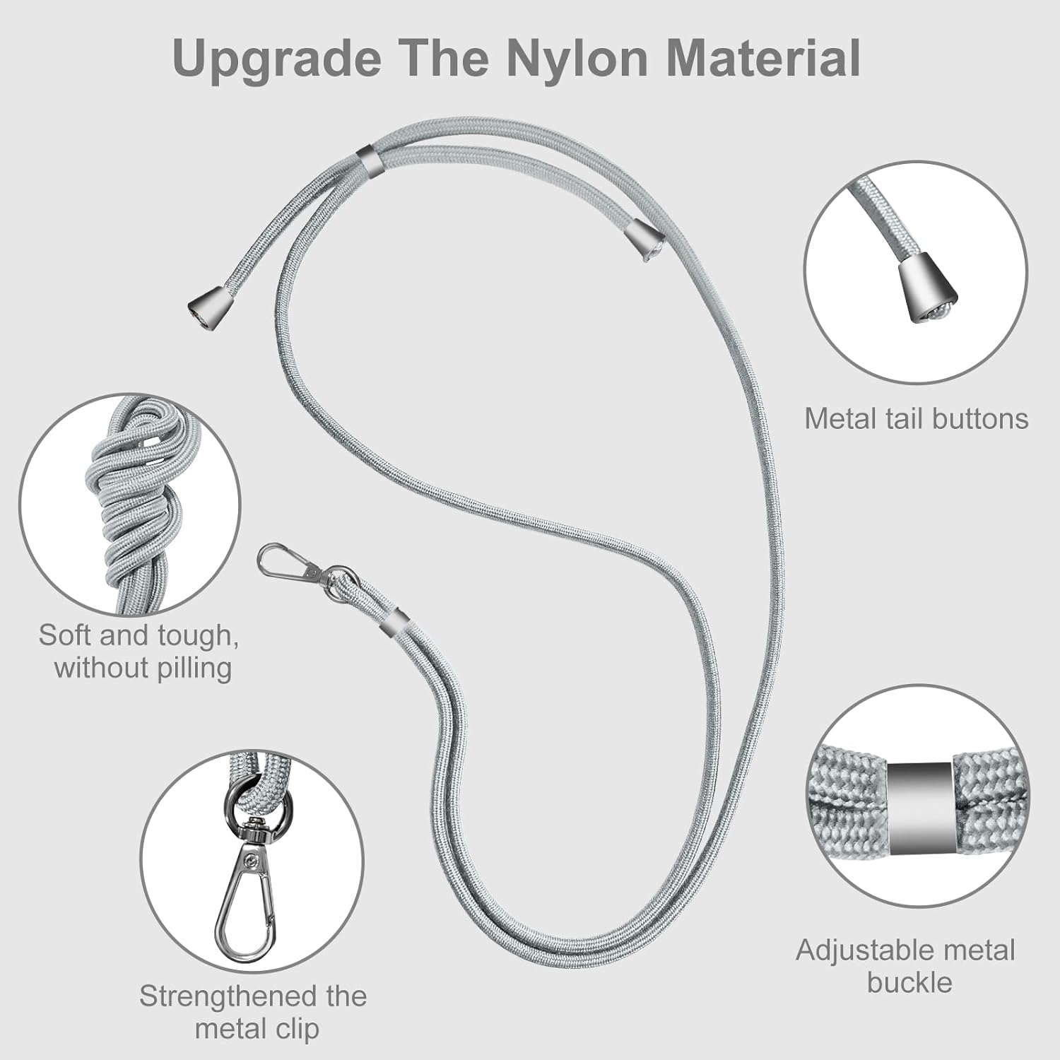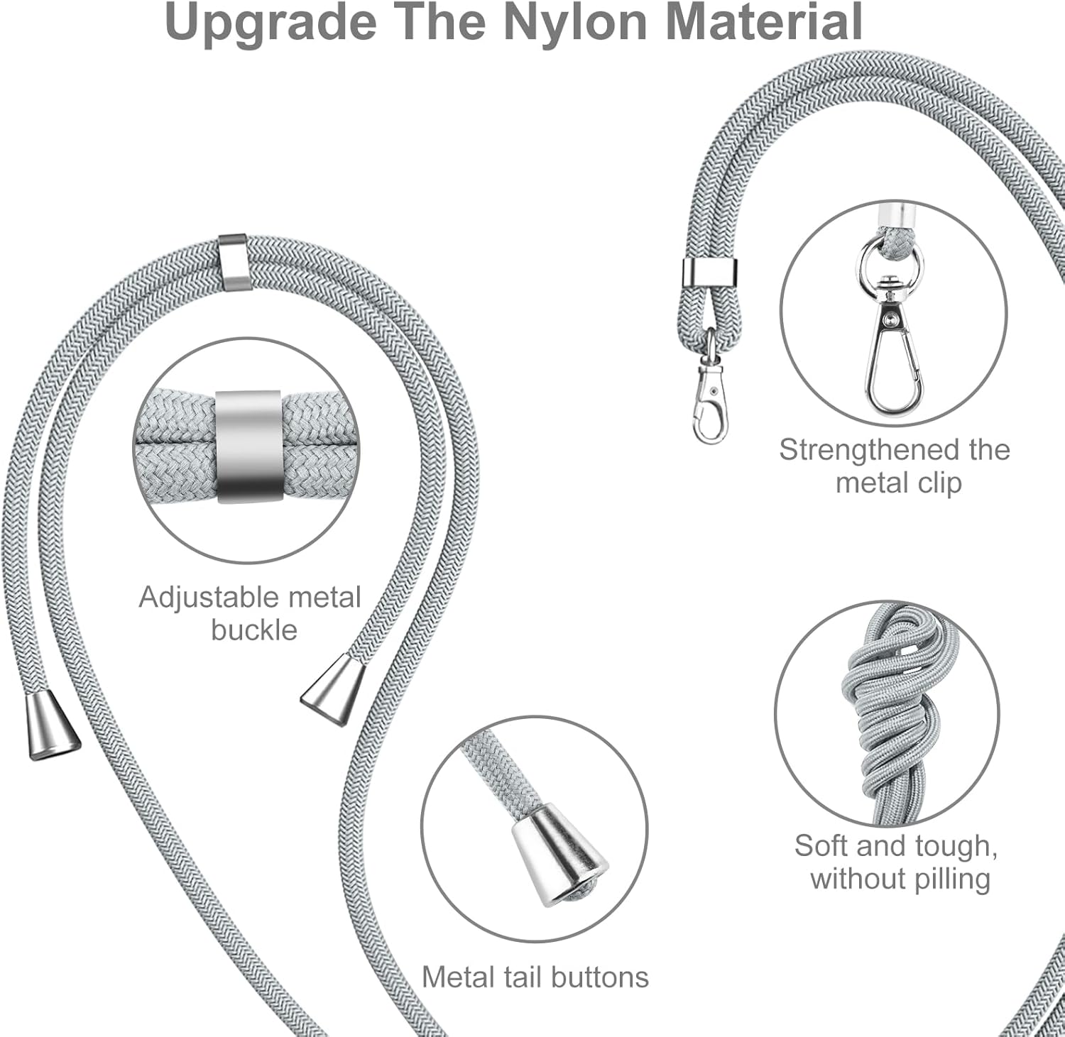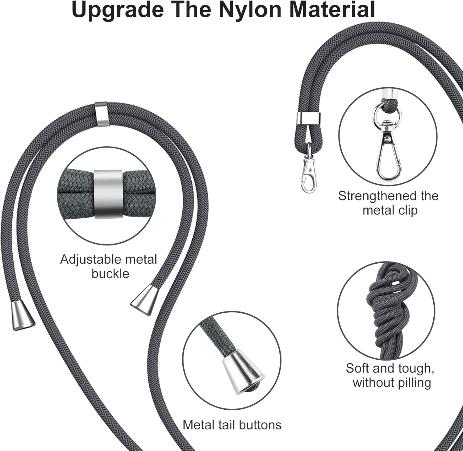La cuerda está fabricada en nailon suave y muy resistente a tirones y desgarros con un gancho de metal para fijar tu teléfono móvil y otros accesorios. El parche de sujeción está fabricado en Plástico TPU antideslizante que garantiza la seguridad de su teléfono móvil y accesorios.