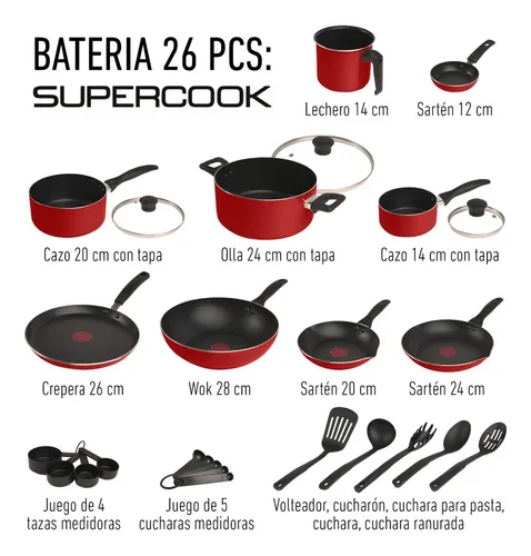 La Batería De Cocina T-fal Supercook 26 Piezas Antiadherente es el set perfecto para equipar tu cocina con utensilios de alta calidad. Con piezas como cuchara, cucharón, olla, sartenes y más, tendrás todo lo necesario para preparar deliciosas comidas.