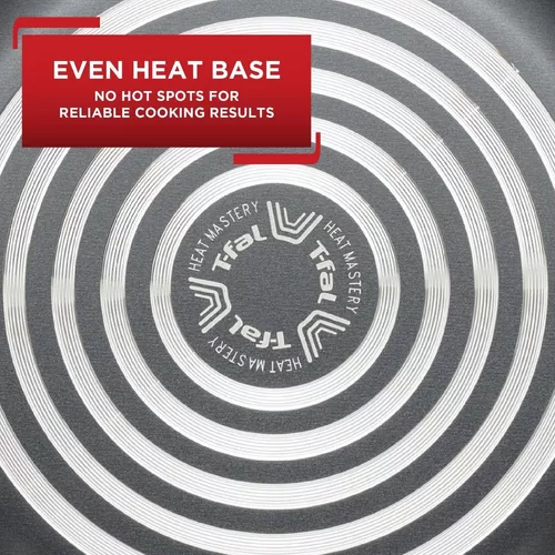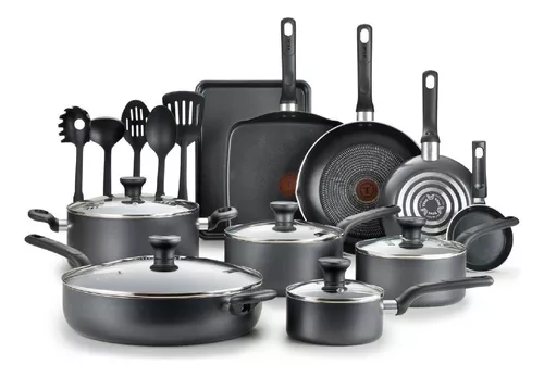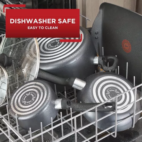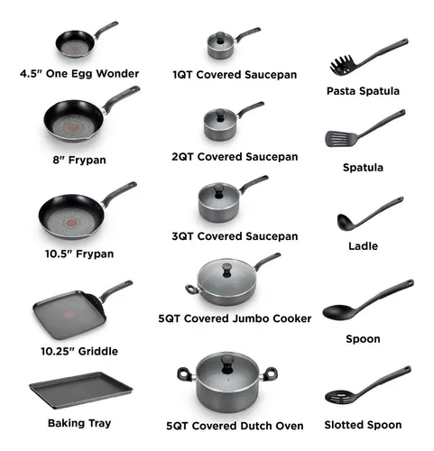 Cocinar y limpiar es más fácil con el juego antiadherente de 20 piezas T-fall Easy Care. Incluye 4.5 "One Egg Wonder, sartén de 8" con pico vertedor, sartén de 10.5 "con pico vertedor, plancha de 10.25", olla gigante 5QT con tapa de vidrio, cacerola 1QT con tapa de vidrio, cacerola 2QT con tapa de vidrio, cacerola 3QT con tapa de vidrio, olla 5QT con tapa de vidrio, bandeja para hornear, espátula para pasta, espátula, cucharón, cuchara y espumadera. El interior antiadherente Pro-Glide asegura una fácil liberación de los alimentos y permite una cocción saludable con poco o nada de aceite. El indicador de calor Thermo-Spot muestra cuando las cacerolas están perfectamente precalentadas para comenzar a cocinar, y la base de calor uniforme no permite puntos calientes. Cuenta con asas cómodas y tapas de vidrio templado ventiladas. Apto para lavavajillas y horno hasta 350 ° F; todas las superficies de cocción son compatibles, excepto la inducción.