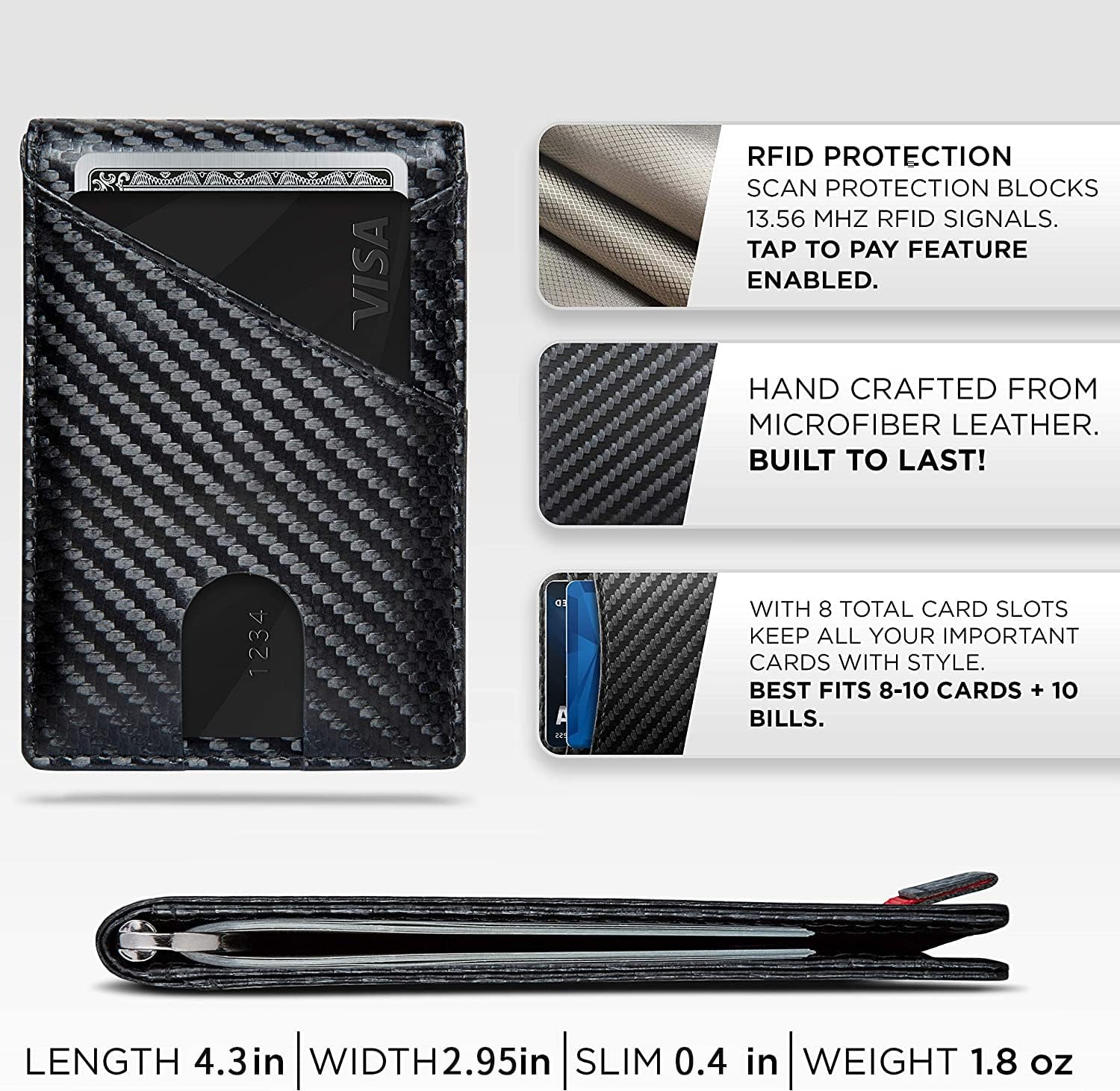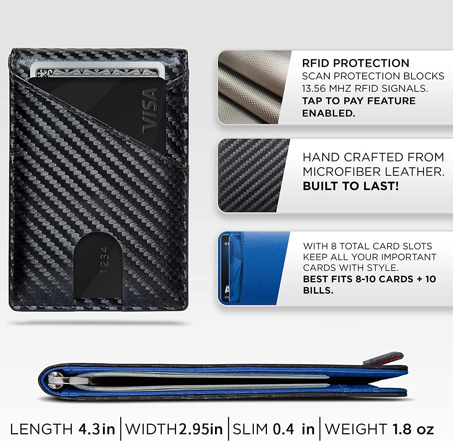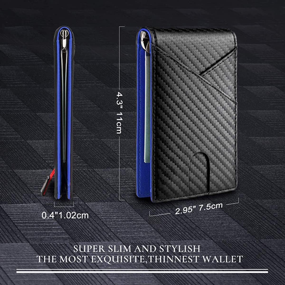 2. Tamaño del producto: Portafolios delgada de 4.3 x 2.95 x 0.4 pulgadas. Capacidad para 8-10 tarjetas, más efectivo