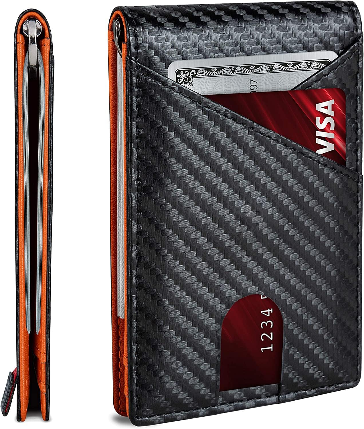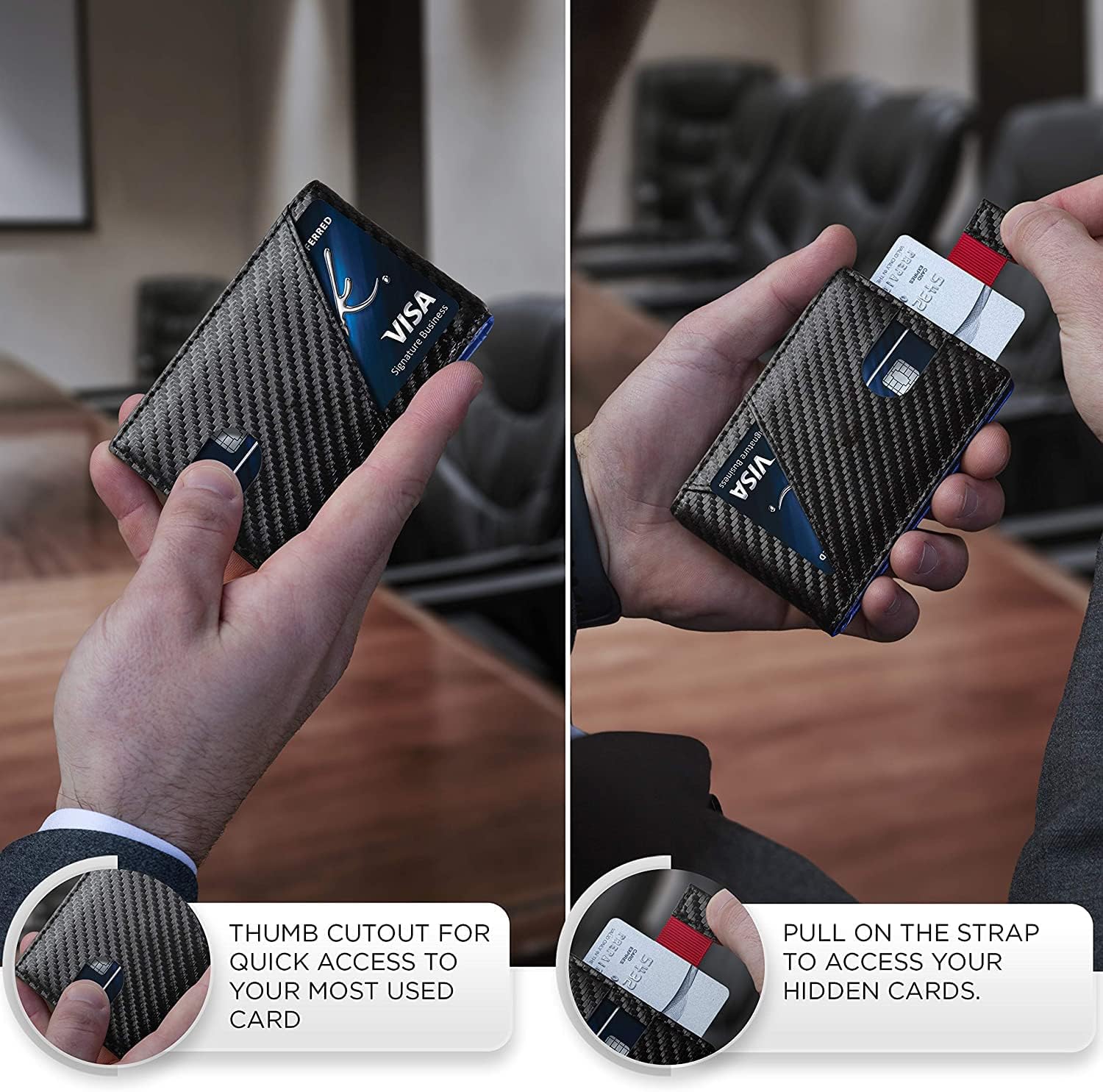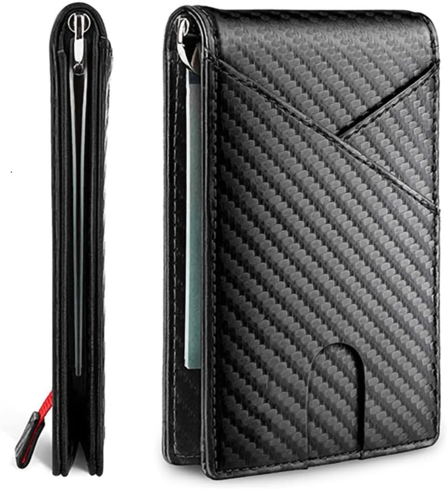 - [DISEÑO ELEGANTE] - La portafolios con clip para dinero mide 4.3 x 2.95 x 0.4 pulgadas. Pero no te dejes engañar por el tamaño de la mini portafolios. Tiene capacidad para 8 - 10 tarjetas, con ranuras ocultas y fácil acceso a 5 tarjetas antes de abrir el biplegado. Utiliza la correa para un rápido dibujo de 3 a 4 tarjetas y las ranuras de agarre rápido para tus dos tarjetas más usadas.