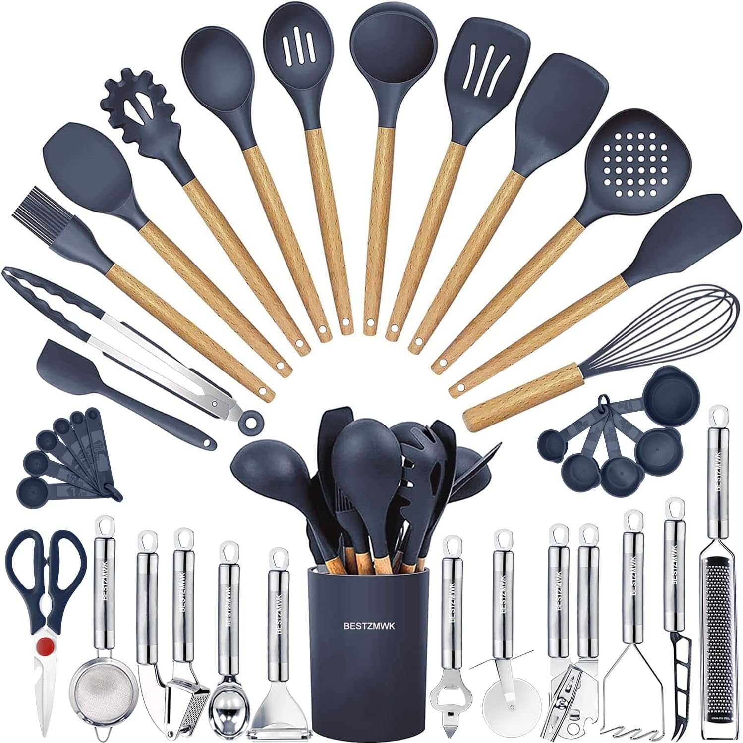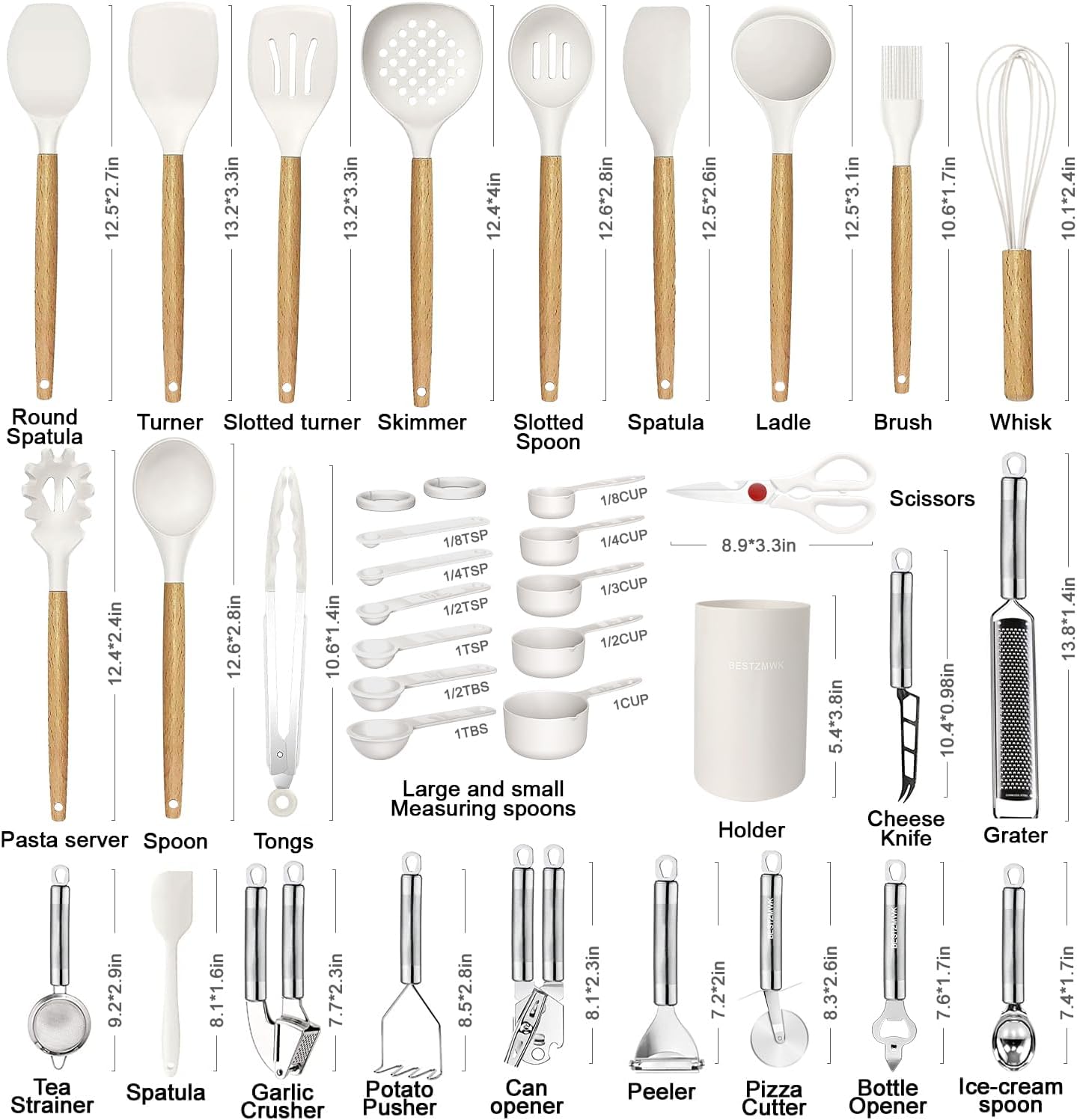 - 35 utensilios de cocina: el juego de utensilios incluye todo lo que necesitas para cocinar ese plato perfecto, incluye espátula ranurada, cuchara ranurada, espátula flexible, volteador ranurado, volteador sólido, servidor de pasta, cuchara sólida, pinzas de cocina, cuchara escurridor, batidor, cucharón de sopa profundo, espátulas, cepillo, pelador, cortador de pizza, abridor de botellas, patatas, empujador, ii cuchara de ce-cream Abrelatas, rallador, tijeras, tazas medidoras y cucharas, ganchos, colador de té, trituradora de ajo, cuchillo de queso, espátula, soporte