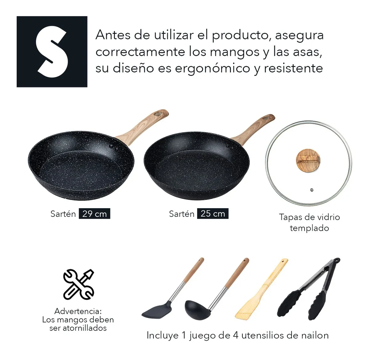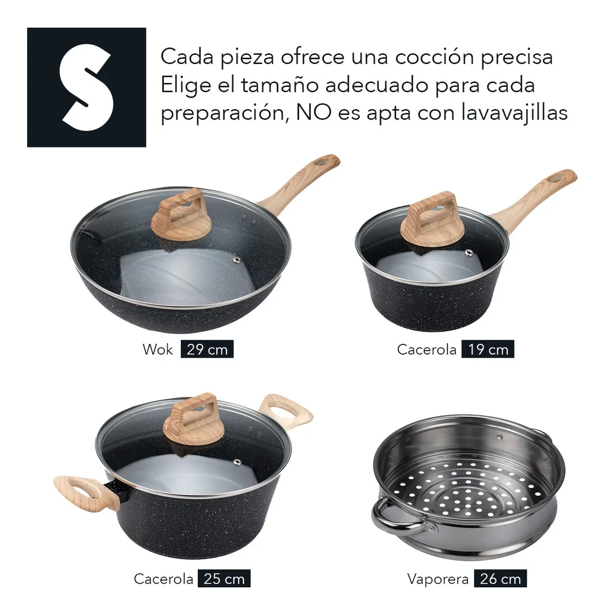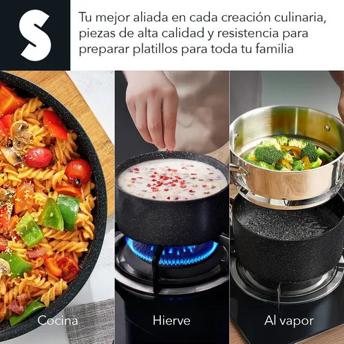 - Incluye 13 piezas de alta calidad: 1 wok de 29 cm con mango, 1 sartén de 29 cm con mango, 1 sartén de 25 cm con mango, 1 vaporera de 26 cm con 2 asas, 1 cacerola de 25 cm con 2 asas, 1 cacerola de 19 cm con mango, 4 utensilios de cocina y 3 tapas de vidrio templado.