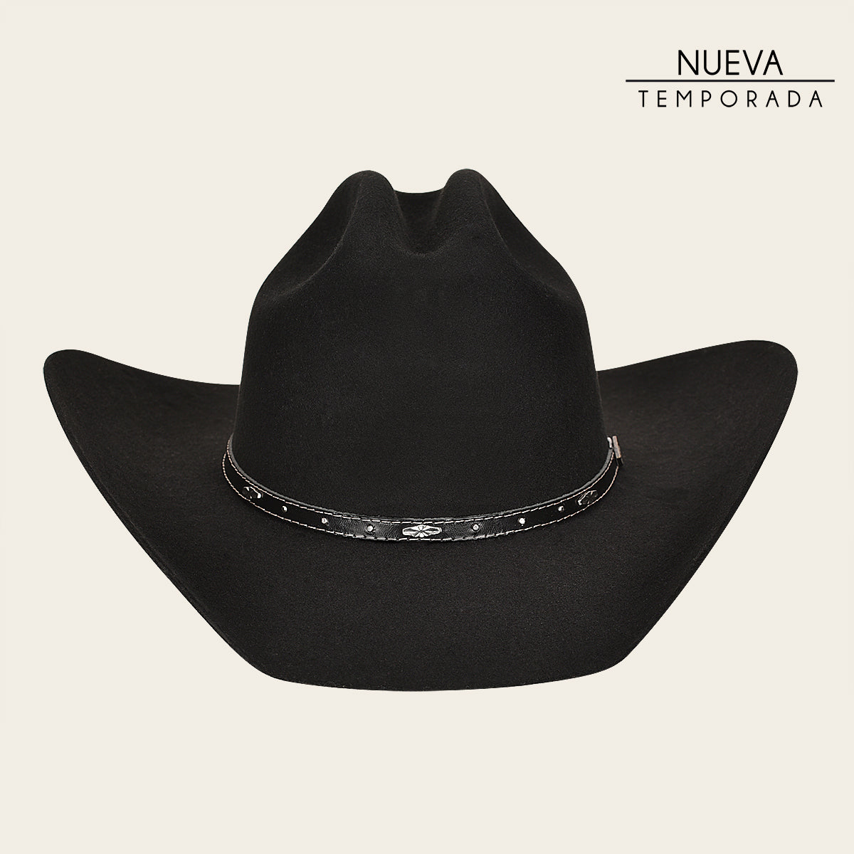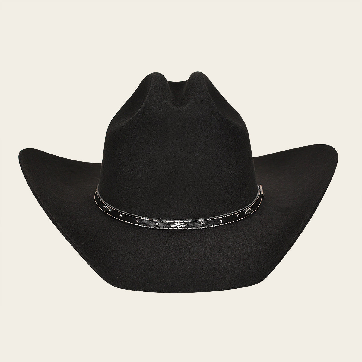 Sombrero de lana. Presenta ala de 4 pulgadas, toquilla en piel genuina de bovino con estoperoles. Con forro de satín y tafilete en piel genuina de bovino.