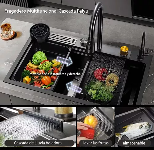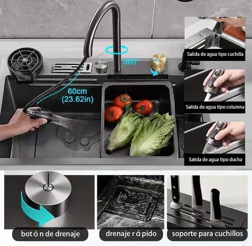 Diseño elegante y práctico: Fregadero de acero inoxidable negro con múltiples funciones. El interior del fregadero cuenta con rieles dobles para colocar diversos accesorios, ahorrando espacio en la cocina.
