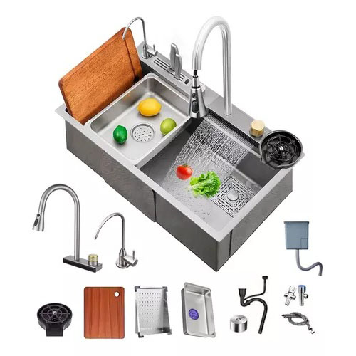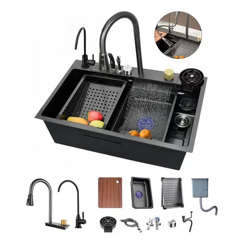 1 * enjuague de tazas, 1 * fregadero de cocina, 1 * grifo extraíble, 1 * grifo wurificador de agua, 1 * juego de drenaje con perilla de control, 1 * lavabo móvil, 1 * portacuchillas, 1 * válvula de esquina y tubería de agua, 1 escurridor, 1 tabla de cortar |
