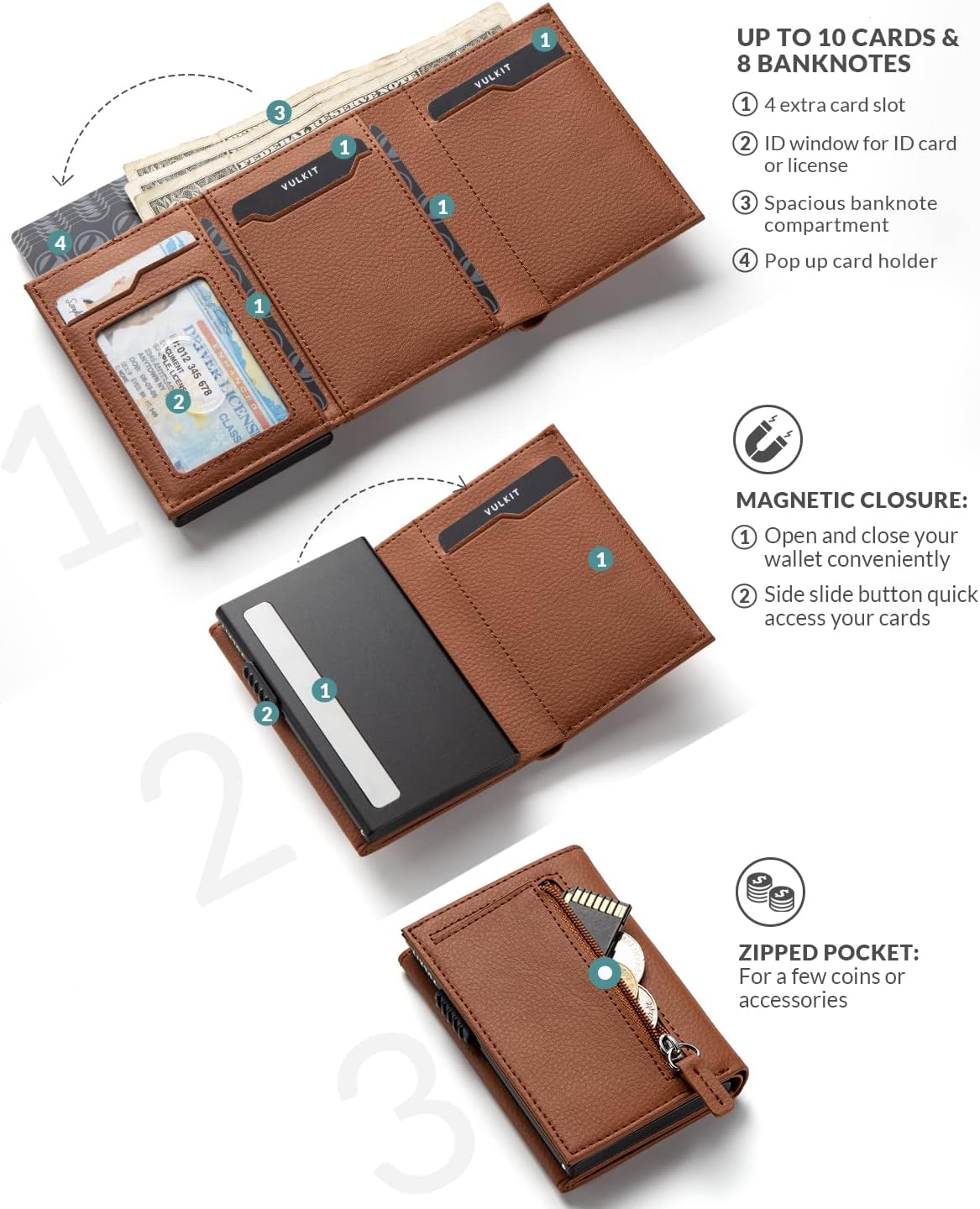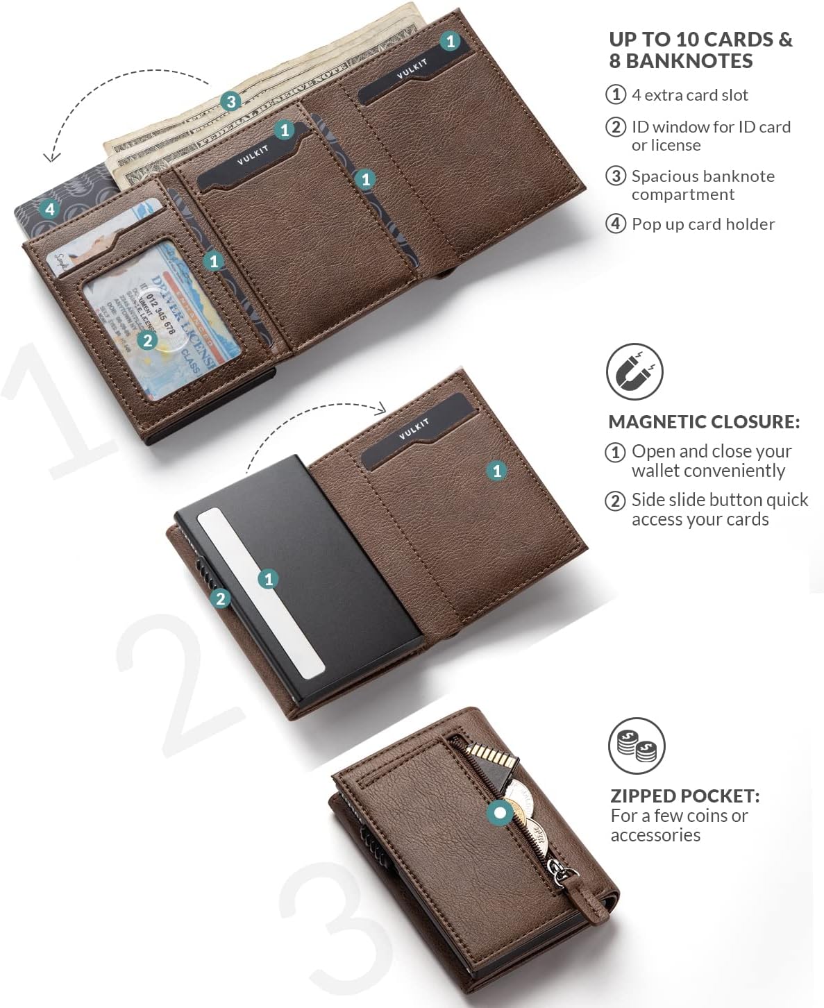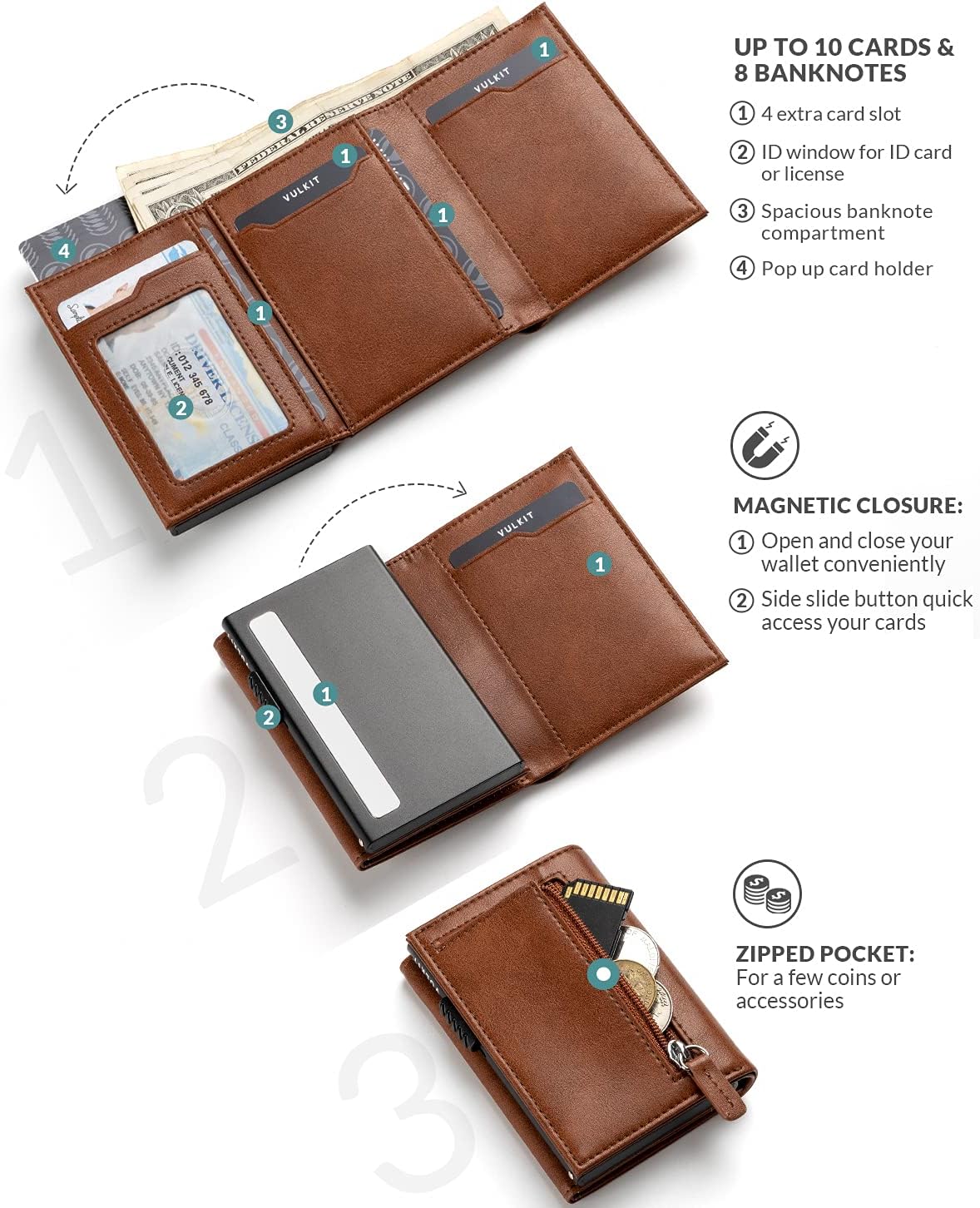 • Sostenga 10 tarjetas con la ventana de identificación visible: mantenga 5 tarjetas en caso de tarjeta emergente. Ventana de identificación visible para la licencia, y tiene 4 tragamonedas adicionales internas para tarjetas.