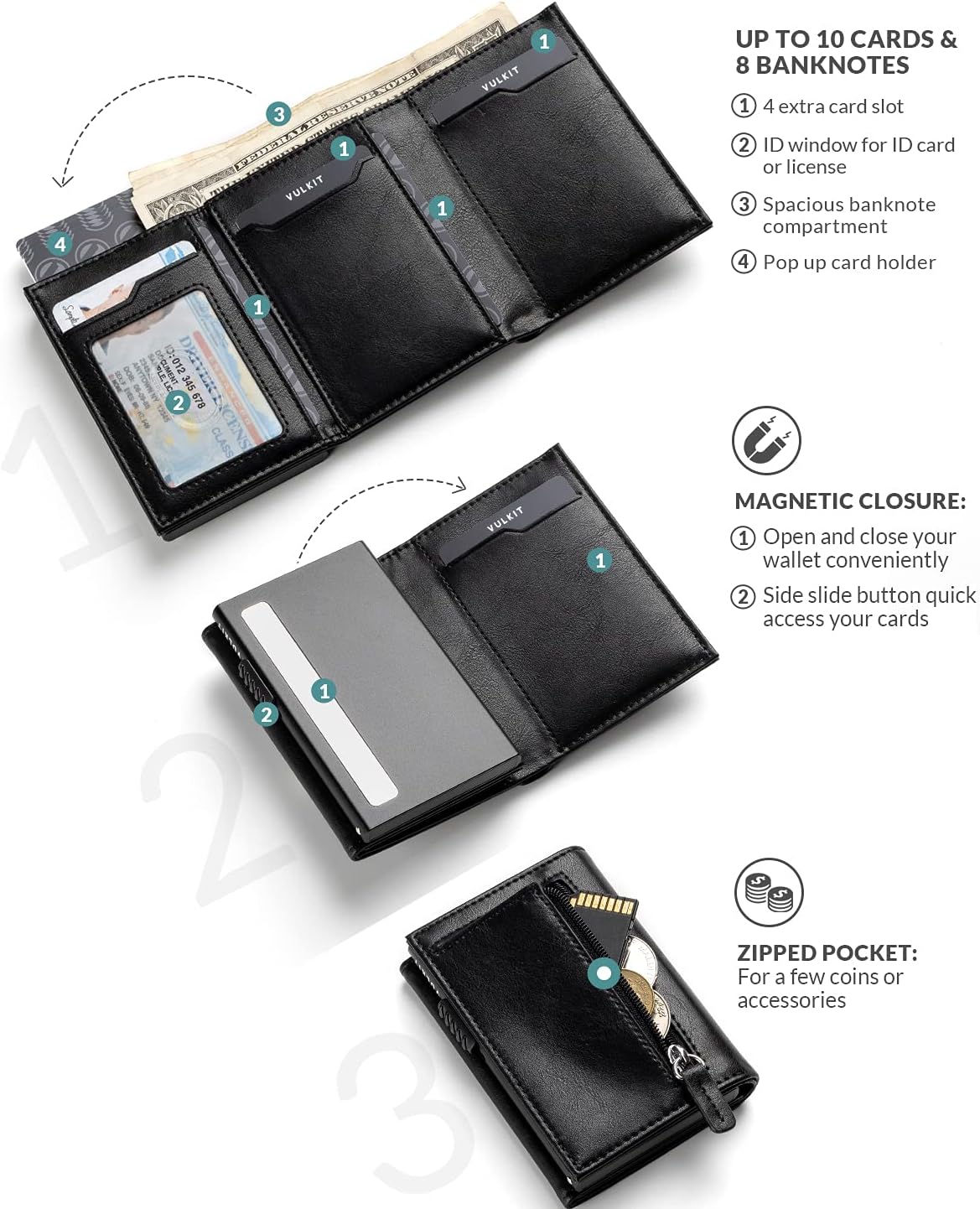 VULKIT Tarjetero de cuero con bolsillo de moneda cierre del imán billetera para efectivo y monedas (Negro)