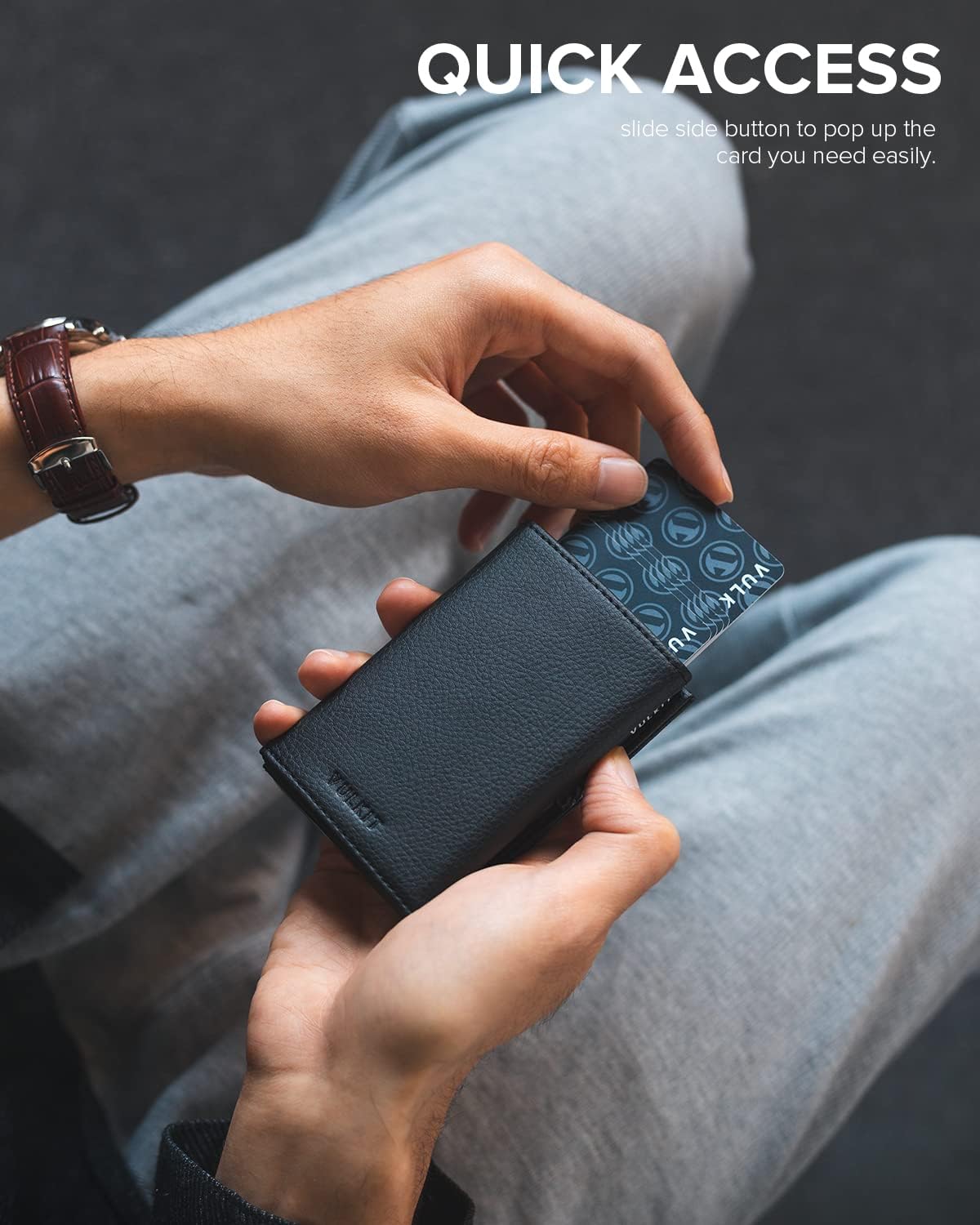 Interruptor inferior deslizante para mostrar tarjetas. 4 bolsillos adicionales para su conveniente para tarjetas. Ventana de identificación visible incluida para su licencia de conducir.